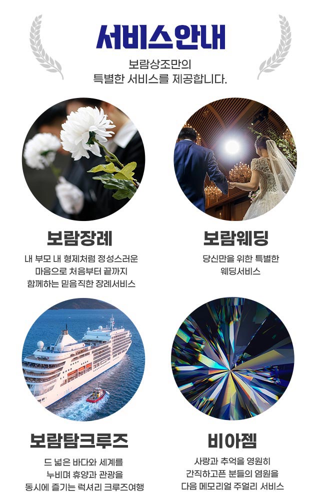 *보람상조가 국내 최초로 회원님께 제공해 드리는 스페셜 서비스는 장례예식의 촬영 등이 포함되어 있어 회원님께서 요청해주셔야 제공해 드릴 수 있습니다. | |||